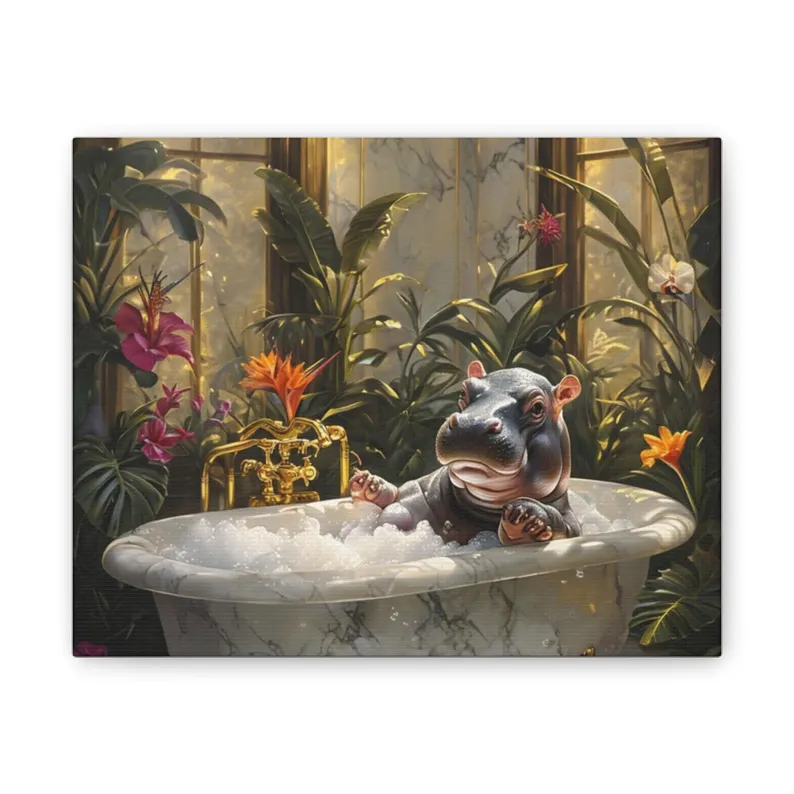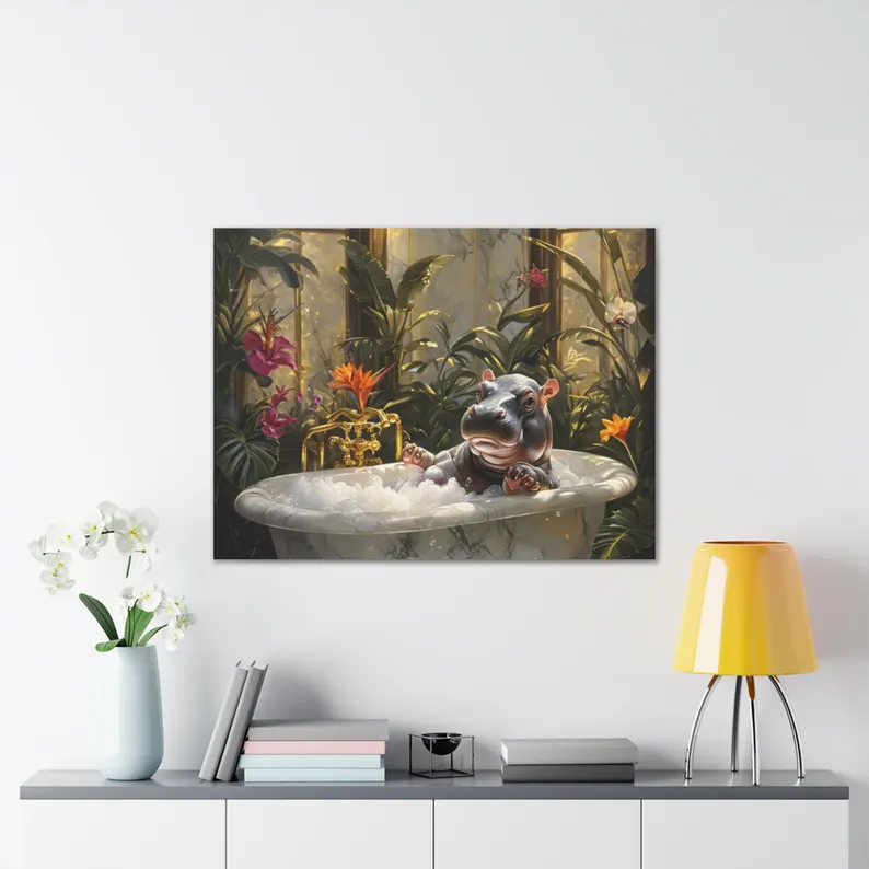 Whimsical Hippo Bath Canvas Art, Cute Animal Decor, Nursery Wall Art, Playful Home Decor, Gift for Kids, Bathroom Wall Art, Unique Artwork
